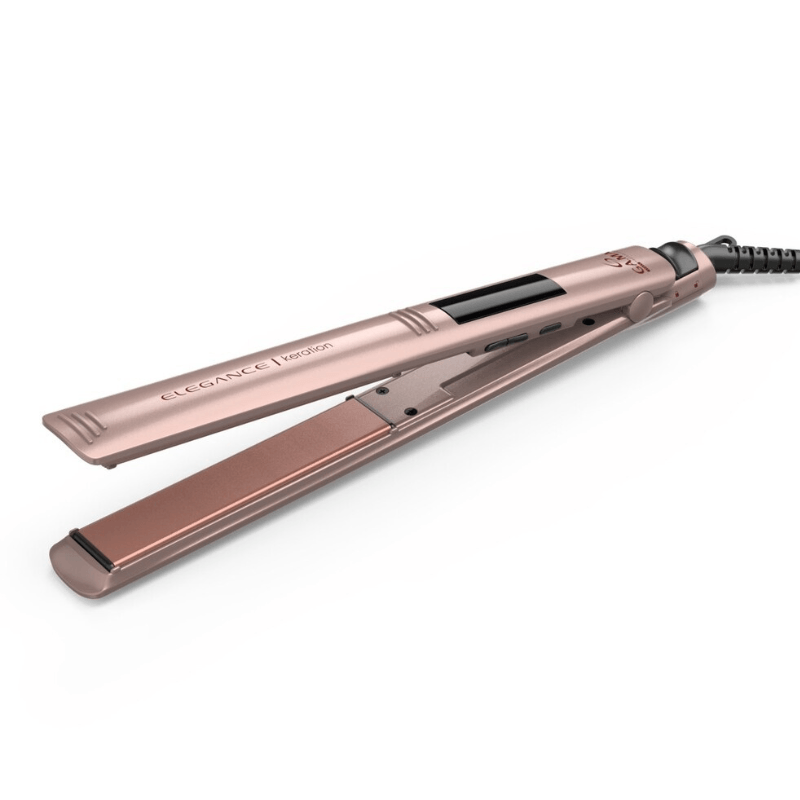 La alaciadora Elegance LED Keration cuenta con placas largas y display LED ajustable que permiten un alisado uniforme, rápido y con control de temperatura, además de proteger la keratina natural para un resultado fuerte, liso y brillante.